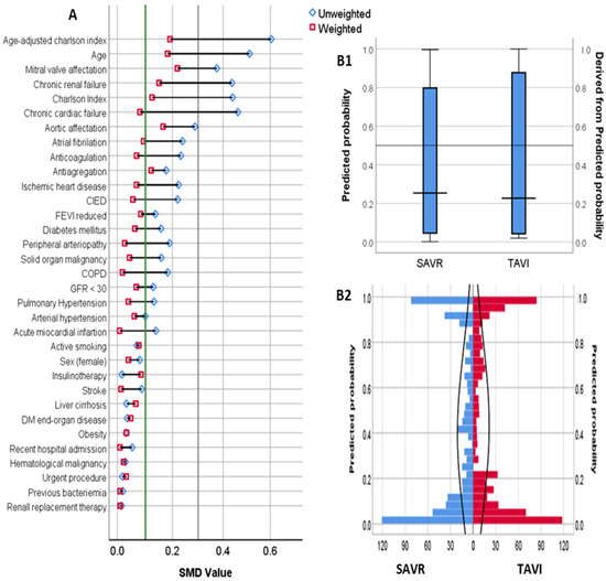 Covariates and propensity score distribution among IPTW cohort. (A): Standardized mean difference (SMD) among baseline covariates. Green line represents SMD of 10%. Blue dot represents the SMD value in the unweighted cohort. Red dot represents the value in the Inverse Probability of Treatment Weighted cohort. B: Propensity score of TAVI numeric (B1) and absolute (B2) distribution among patients with TAVI and SAVR in the IPTW cohort.