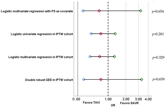In the IPTWc, IE risk after TAVI versus SAVR did not differ: OR 0.65, 95% CI 0.23–1.32, p = 0.329. There was no association between the type of procedure and IE risk in other prespecified sensitivity analyses (Figure 3).
