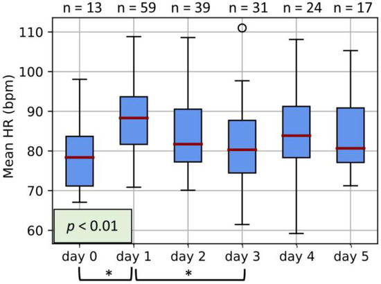 Figure 1. Boxplots of the HR of participants on days 0 to 5. Boxplots represent the median, interquartile range, and interdecile range of the values. Day 0 represents measurements taken before the first injection of Betamethasone, while day 1 represents 24 h after the first injection, day 2 represents 48 h after the first injection, etc. * represents a statistically significant finding with p < 0.05. The number of measurements incorporated into each day is displayed at the top of the graph.