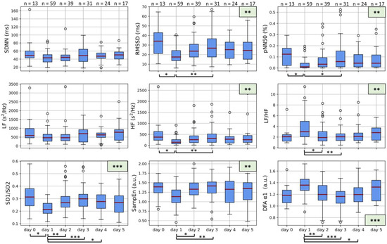 Figure 2. Boxplots of maternal HRV on days 0 to 5. Boxplots represent the median, interquartile range, and interdecile range of the values. Day 0 represents measurements taken before the first injection of Betamethasone, while day 1 represents 24 h after the first injection, day 2 represents 48 h after the first injection, etc. * represents a statistically significant finding with p < 0.05, while ** presents p < 0.01 and *** represents p < 0.001. The number of measurements incorporated into each day is displayed at the top of the graph.