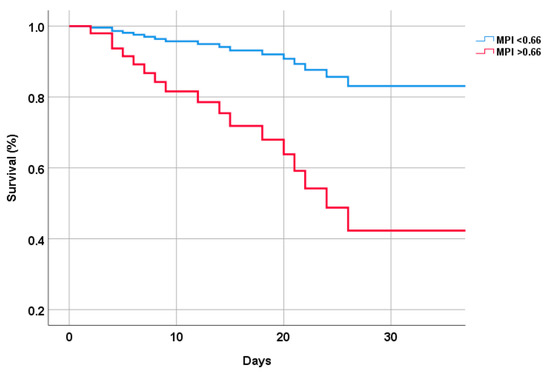 Figure 1 shows the survival curves according to the Brief-MPI values at the baseline evaluation. In the analyses adjusted for sex, compared to patients with a Brief-MPI ≤ 0.66, a Brief-MPI value > 0.66 upon admission to the ward was associated with a significant risk of death or admission to sub-intensive care (HR = 8.52; 95% CI: 4.24–16.78; p < 0.0001). In particular, the mean survival rate 16 days after admission was approximately 75%.