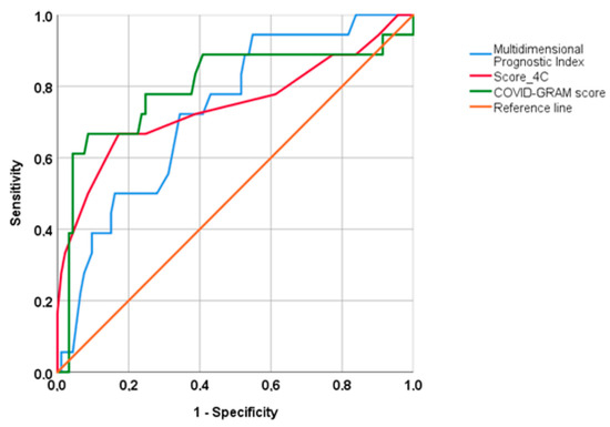 However, as shown in Figure 2, both the Brief-MPI (AUC 0.754; 95% CI: 0.629–0.880; p = 0.001), the 4C score (AUC 0.746; 95%CI: 0.594–0.897; p = 0.001) and the COVID-GRAM score (AUC 0.826; 95% CI: 0.700–0.951; p < 0.0001) were good predictors of unfavorable outcomes in older patients, without any significant differences (p = 0.44 vs. COVID-GRAM and p = 0.54 vs. 4C score).