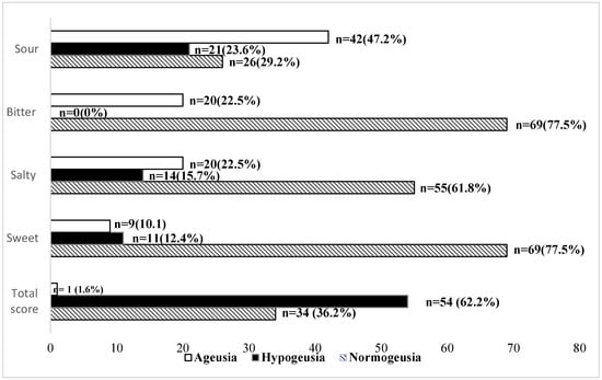 The evaluation of the objective perception of the four flavors revealed that the sour taste was the most altered. Indeed, ageusia and/or hypogeusia were observed in 70.8% of the cases for sour taste, 38.2% of the cases for salty taste, and 22.5% of the cases for sweet and bitter tastes (Figure 1).