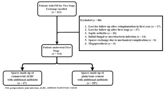 Following institutional review board approval, a retrospective single institutional study was performed to identify 422 chronic periprosthetic joint infections (PJIs) in patients who underwent two-stage exchange arthroplasty from January 2014 to August 2021. The diagnosis of PJI was based on the definition from the 2018 International Consensus Meeting []. We excluded patients who were lost to follow-up after reimplantation in the first year, those who were lost to follow-up after the first stage, and those with native septic arthritis. Patients with an atypical infection, including fungus and mycobacteria infection, spacer exchange due to a mechanical complication, and those with a megaprosthesis were also excluded. After 88 patients were excluded because of the aforementioned criteria, a total of 334 patients (157 knees and 177 hips) with chronic PJI fulfilled the inclusion and exclusion criteria, including 47 patients with commercial ALBC and 287 patients with non-commercial bone cement at the first stage of a two-stage exchange (Figure 1).