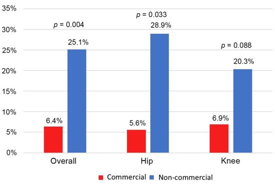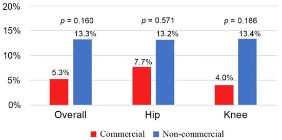 The total reimplantation rate was 84% (279/334). The overall reinfection rate after reimplantation was 12.2% (34/279). The reinfection rate was 5.3% in the commercial cement group and 13.3% in the non-commercial cement group (p = 0.160, Figure 3). There was no significant difference in the reinfection rate between the commercial and non-commercial cement groups when stratified by hips and knees. For revision hip, the reinfection rate was 7.7% in the commercial cement group and 13.2% in the non-commercial cement groups (p = 0.571). For revision knee, the reinfection rate was 4.0% and 13.4% in the commercial and non-commercial cement groups (p = 0.186), respectively. There was no significant difference between the two groups regarding the microorganism (Table 3).