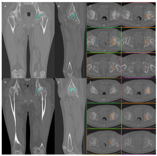 AHCR (A–C) and HHCR (D–F) cup planning in the same Crowe III patient: cup overhanging was assessed in the frontal view (A,D), in the sagittal view (B,D) and in the axial view (C,F).