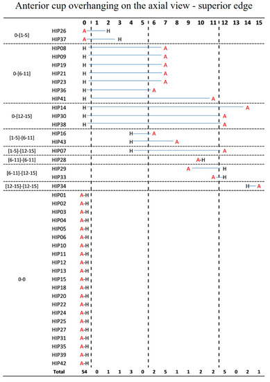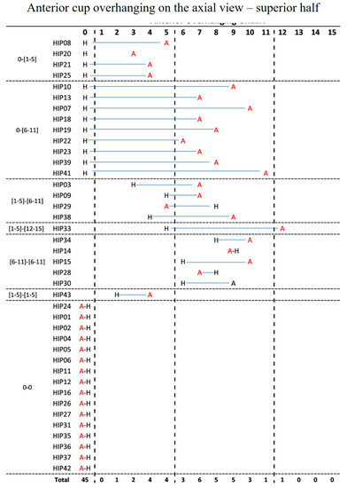 Anterior cup overhanging on the axial view in the middle of the superior half of the cup in the same case according to the two configurations AHCR (A) and HHCR (H).