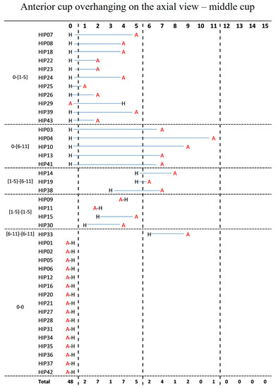 Anterior cup overhanging on the axial view at the center of the cup in the same case according to the two configurations AHCR (A) and HHCR (H).