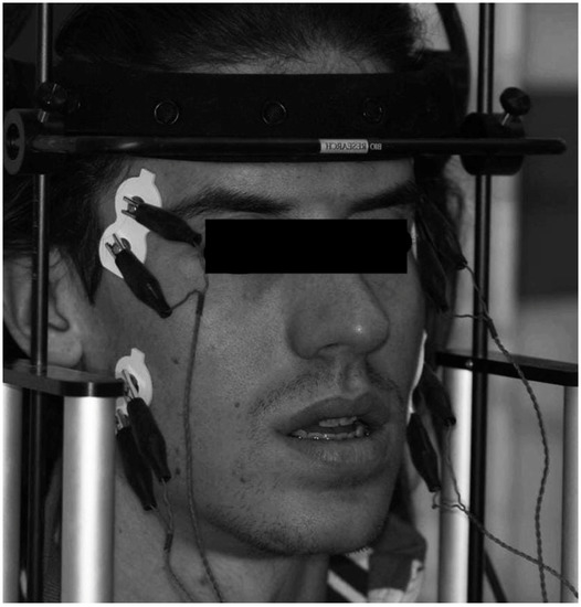 The skin of the face was cleaned using a wad soaked in Neoxinal (0.5% chlorhexidine in ≥70% alcohol) and disposable silver/silver chloride bipolar electrodes (Duo-Trode; Myo-Tronics Inc., Seattle, WA, USA) were positioned according to the recommendations of SENIAM (Surface EMG for Non-Invasive Assessment of Muscles) and then a reference electrode was located on the forehead for the electromyographic acquisition [31] (Figure 2).