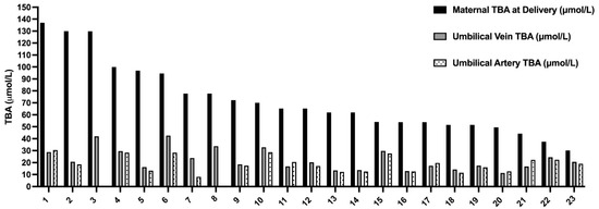 Figure 1. The total bile acids levels in maternal serum delivery, umbilical vein, and umbilical artery. The TBA level in maternal serum at delivery (black) compared to TBA levels in umbilical vein (gray, 23 samples) and umbilical artery (dotted, 19 samples). TBA—total bile acids in μmol/L.