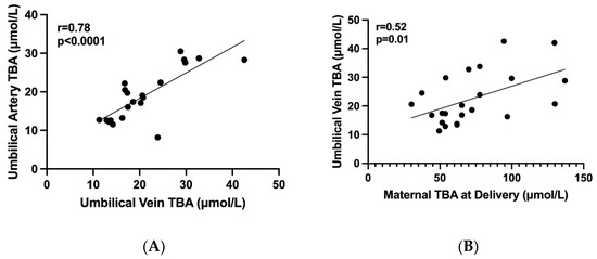 Figure 2. The correlations between maternal and fetal TBA levels. Graphic diagrams which show the correlations between maternal and fetal TBA levels. (A) A positive correlation between TBA levels in umbilical artery and vein (r = 0.78, p < 0.0001), (B) A positive correlation between TBA levels in maternal serum at delivery and umbilical vein (r = 0.52, p = 0.01), TBA—total bile acids in μmol/L.