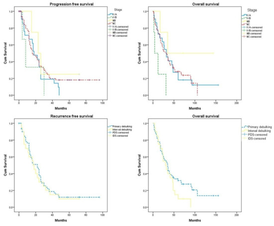 The median follow-up of our cohort was 32 months (2–156). The recurrence free survival of the entire cohort was 18 months (12.69, 23.31) and the overall survival 47.34 months (36.92, 57.75). Of all the investigated factors, only stage IVb (p = 0.027) and interval debulking surgery (p = 0.042) significantly affected overall survival rates. Of note, overall survival rates in the interval debulking surgery group start to differentiate compared to the primary debulking group after the 50th month postoperatively (log-rank = 0.038) (Figure 1). After subgrouping cases according to the level of tumor resection, we observed that optimally cytoreduced patients had increased survival rates compared to patients with R1 excision (28.91 (20.74, 37.08) months vs. 19.71 (12.99, 26.42) months); however, the result did not reach the appropriate significance level (log-rank = 0.389). Neither of the investigated parameters had a detrimental impact on progression-free survival. Table 2 and Figure 2 summarize survival outcomes among subgroups of patients that were selected after considering factors that could potentially affect survival rates.