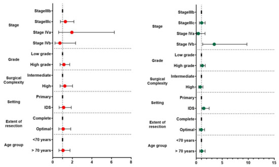 Forest plots of hazard ratios and 95% CIs of factors affecting progression-free (right side—red dots) and overall survival (left side—green dots) rates.