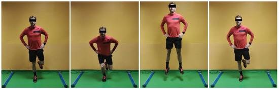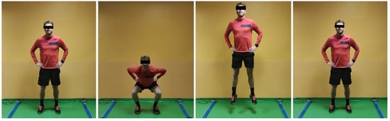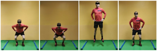 Two types of bipodalic jumps were tested: squat jump (SJ), and countermovement jump (CMJ) (Figure 1 and Figure 2). Then, monopodalic jumps were performed: CMJ, and side hop test (Figure 3 and Figure 4). Each of them was performed with the uninjured limb first, followed by the injured. The SJ consisted of a vertical jump performed from a half-squat position with the knees flexed at 90°. The CMJ was performed in the same fashion, with the exception that the starting position was an upright position, and the jump was performed after a quick sinking. Every jump was performed 3 times, and the average value was recorded. The side hop test consisted of performing as many jumps as possible during a period of 30 s between two parallel strips on the floor put at a distance of 30 cm without touching the strips (a maximum of 25% error was allowed; otherwise, the test was repeated). Limb Symmetry Index (LSI) was calculated as a percentage of test performance on the injured/operated limb compared to the contralateral limb.