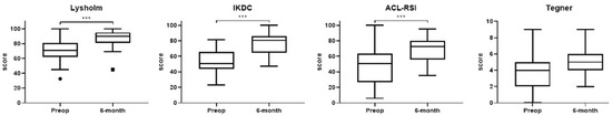 Box-plots showing differences in outcome scores from pre-operative to 6-month follow-up after surgery. The black line inside the box represents median value. The lowest bar represents the minimum value, the bottom and top of the boxes represent the interquartile range (25th and 75th percentiles), and the top bar represents the maximum value. Points outside the limits represent outliers *** p < 0.001.