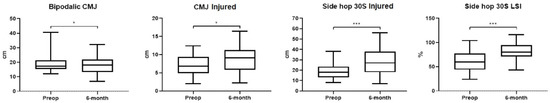 Box-plots showing differences in jumping performances from pre-operative to 6-month follow-up after surgery. The black line inside the box represents median value. The lowest bar represents the minimum value, the bottom and top of the boxes represent the interquartile range (25th and 75th percentiles), and the top bar represents the maximum value. * p < 0.05; *** p < 0.001.