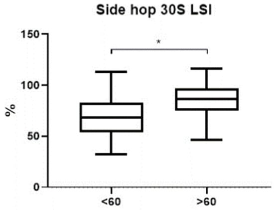 Box-plot showing differences in Side Hop test LSI between the two groups. The black line inside the box represents median value. The lowest bar represents the minimum value, the bottom and top of the box represent the interquartile range (25th and 75th percentiles), and the top bar represents the maximum value. * p < 0.05.