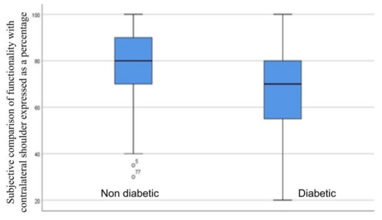 To assess the difference in function compared with the contralateral shoulder as a dependence of the presence of diabetes, the Mann–Whitney U test was used (Mann-Whitney U = 518.000; Z = −1.642; p-value = 0.101) (Figure 1).