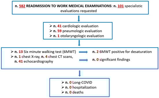 All 582 HCWs affected by BI underwent a health surveillance medical examination to allow their readmission to work at the Operative Unit of Occupational Medicine (Figure 1). As a result, 101 specialist evaluations (59 pneumological evaluations, 41 cardiological evaluations and 1 otolaryngological evaluation), 46 instrumental examinations (41 echocardiograms, 4 chest CT scans, 1 chest X-ray) and 13 six-minute walking tests (6MWTs) were requested to identify the persistence of signs and symptoms related to the disease. In particular, 88% of HCWs affected by BI were still symptomatic after the negative swab, at the time of the medical examination for readmission to work. The most frequent signs and symptoms were cough (57%), nasal congestion/rhinorrhea (52%), myalgia/asthenia (49%), headache (33%), palpitations (30%), ageusia/anosmia (16%) and dyspnea (12%). None of the instrumental tests carried out showed any new findings of pathological significance, and only two 6MWTs were positive for desaturation. All cases of symptomatic BI at the time of readmission to work showed progressive disappearance of symptoms in the following days, such that no cases of long-COVID and no hospitalizations or deaths were recorded.