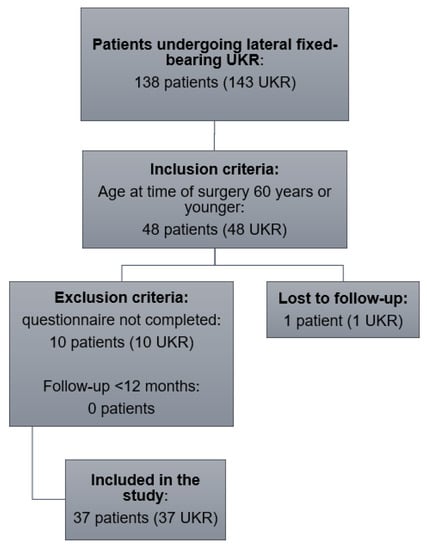 The current study is based on the retrospective analysis of prospectively collected data from a series of patients who underwent lateral UKR for isolated OA of the knee. A total of 143 UKR were performed in 138 patients between 2013 and 2020 using the Oxford Fixed Lateral prosthesis (Zimmer Biomet UK, Bridgend) at the Department of Orthopaedic Surgery of the University Hospital of Heidelberg. Patients aged 60 years or younger at the time of surgery were enrolled in this study with a minimum follow-up (FU) of 12 months.