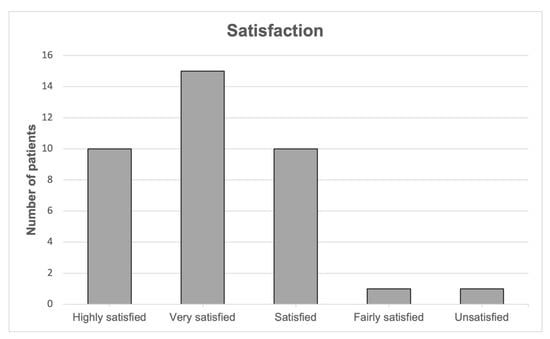 Overall, 35 patients (94.6%) were satisfied, very satisfied or highly satisfied with the outcome, one patient (2.7%) was fairly satisfied and one patient (2.7%) was unsatisfied (Figure 2). No difference in satisfaction level between females and males was observed (p = 0.342).