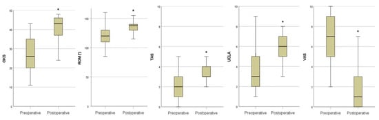 PROMs preoperatively and at last follow-up. * p < 0.001. OKS: Oxford knee score; ROM: range of motion; TAS: Tegner activity score; UCLA: University of California Los Angeles activity scale; VAS: visual analogue scale.