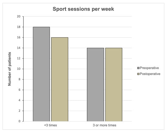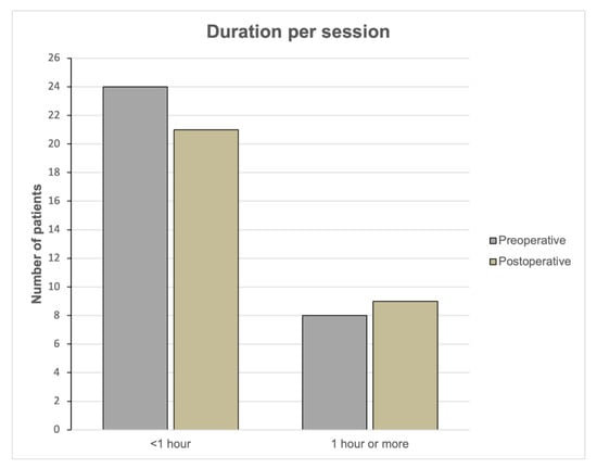 The extent of activity was assessed by the parameters “number of patients who were active for at least one hour per session” and “number of patients who were active at least three times a week” (Figure 4 and Figure 5). There were no significant changes from pre- to postoperation in these parameters.
