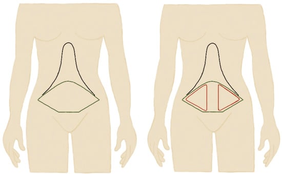 All operations were performed under general anesthesia by the same local surgical team. SFP abdominoplasty or dual plane abdominoplasty was widely similar to classic full abdominoplasty [26]. An incision was made to the level of the symphysis pubis, 6–7 cm superior to the anterior vulva commissure, and the abdominal flap was elevated up to the subcostal margin. As an exception, abdominal flaps were elevated and avulsed on a plane of the Scarpa fascia on the infra-umbilical area, excluding a several centimeter-wide vertical line in the midline bilaterally, which reached the pre-muscular plane (Figure 1). Rectus fascia plication could be achieved using interrupted #1 polypropylene sutures. On the supra-umbilical and epigastric areas, flap elevation was carried out on the pre-muscular plane up to the costal margin.
