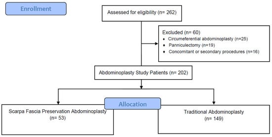 A total of 202 consecutive patients undergoing abdominoplasty after MWL were included in the analysis after the eligibility assessment. Of them, 53 patients were included in the SFP group, while 149 patients were included in the control group (Figure 2). Patient demographics and study group comparisons are shown in Table 1. There was a statistically significant difference only in the sex ratio of the patients, where 87.2% of patients in the control group were female versus 81.1% in the SFP group (Table 1).