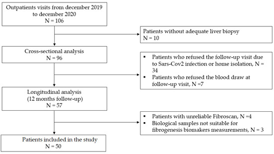 A total of 96 patients were included in the cross-sectional analysis and were scheduled a follow-up visit. A follow-up visit was performed after 12 months from baseline. Of the 96 patients that were enrolled, 50 underwent a second hepatologist consultation and were included in the longitudinal analysis. Of the remaining patients, 34 refused to undergo an onsite visit during the SARS-CoV-2 pandemic outbreak; the other causes for missing follow-up are shown in Figure 1. NAFLD treatment consisted of standard recommendations for lifestyle changes, including both increased physical activity and dietary changes. No patients underwent bariatric surgery for the whole period of observation, nor were they enrolled in clinical trials with investigational products.