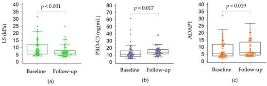 Comparison between baseline and follow-up values of liver stiffness (a), PRO-C3 (b) and ADAPT (c). ADAPT, PRO-C3 based score LS, liver stiffness; PRO-C3, N-terminal pro-peptide of type III collagen.