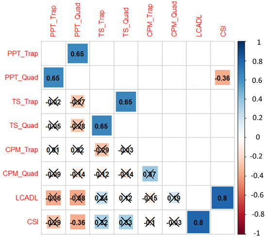 Correlation plot. The correlation coefficients range from −1 (red) to +1 (blue) and are presented with their actual values on the plot. In the lower triangle, correlations that are not statistically significant are marked with a cross. On the upper triangle, only statistically significant correlations are presented. Abbreviations: CPM: conditioned pain modulation, CSI: central sensitization inventory, LCADL: London chest activity of daily living, PFCS: post-COVID-19 functional status scale, PPT: pressure pain threshold, Quad: quadriceps, Trap: trapezius, and TS: temporal summation.