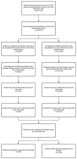 Two distinct populations were included in the present retrospective study. The first population was used to estimate the one-year and lifetime prevalence of adhesive capsulitis of the shoulder in older adults from general practices in Germany in 2021. This population included all individuals aged ≥65 years with at least one visit to one of 1207 general practices in 2021. The second population was used to identify physical and psychiatric conditions significantly associated with adhesive capsulitis. This population included all patients aged ≥65 years with an initial diagnosis of adhesive capsulitis of the shoulder (ICD-10 code: M75.0) between January 2010 and December 2021 (index date; age was assessed at the index date). Additional inclusion criteria were at least five years of observation prior to the index date and at least one visit each year in the five years prior to the index date. After applying similar inclusion criteria, patients aged ≥65 years without adhesive capsulitis were matched (1:5) to those with adhesive capsulitis using a propensity score based on age, sex, and index year. In participants without adhesive capsulitis of the shoulder, the index date was a randomly selected visit date between January 2010 and December 2021. The flow diagram of the second study population is displayed in Figure 1.