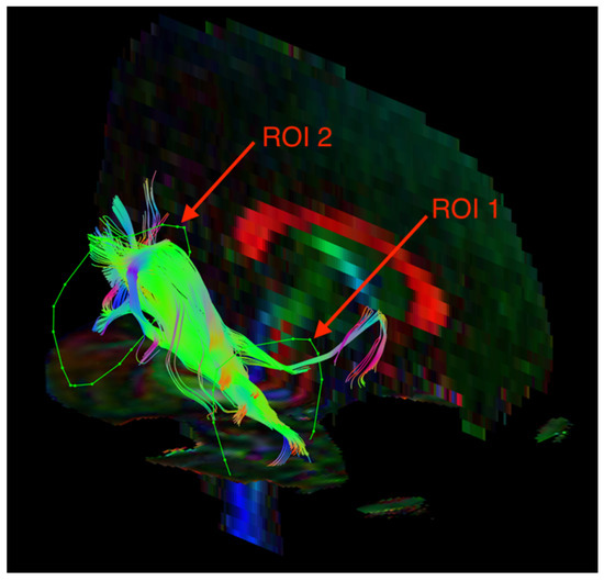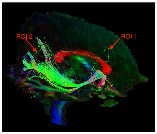 Diffusion tensor tractography of the inferior longitudinal fasciculus (ILF) with fractional anisotropy color maps (mid-sagittal plane). Green, red, and blue colors represent fibers running along the axis (anterior–posterior, left–right, and superior–inferior, respectively). Reproduced from [33].