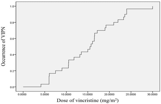 Additionally, this study analyzed the cumulative incidence of VIPN according to the cumulative dose of vincristine using the survival curve. According to the analysis, peripheral neuropathy occurred in 50% of the patients when 15.5 ± 1.77 mg/m2 of vincristine was administered cumulatively. Several previous studies have also found that the incidence of VIPN increases in proportion to the dose of vincristine used in children diagnosed with VIPN [,,]. However, this study presented a specific value of VIPN incidence according to the cumulative dose of vincristine for which the survival curve was applied. Hence, the objective nature of the analysis might be considered an advantage in the present study compared to previous studies.
