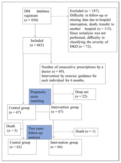 A total of 850 patients registered in our hospital’s outpatient database of diabetes mellitus were included in this study. Of these, 187 cases were excluded, including patients who were difficult to follow up on due to interruption of hospital care, death, and transfer to another hospital and those for whom DKD severity classification was impossible due to lack of data. Of the final 663 participants included in the study, interventions were provided to 89 with consecutive prescriptions for exercise instruction by a physician. Twenty-two patients dropped out during the intervention, and the remaining 67 were classified as the intervention group. A propensity score matching was performed from the historical cohort group based on the basic information of the intervention group and blood sampling data; 67 cases were selected as the control group for this study (Figure 1). Inclusion criteria for the intervention group were type 2 diabetes, DKD (stage I-V), no maintenance dialysis therapy, physician permission for exercise therapy, and no dementia. DKD severity was classified according to eGFR and urinary albumin levels [] (Table S1).
