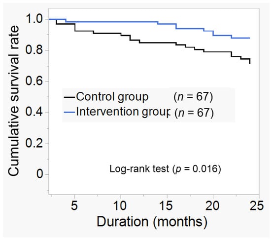 Kaplan–Meier curve for new event incidence. Cumulative survival rates for the composite endpoint included new cardiovascular disease (CVD) and stroke, hemodialysis (HD) induction, and all-cause mortality at 24 months compared to the two groups. The definition of CVD was myocardial infarction, ischemic heart disease, heart failure, peripheral arterial disease, and arrhythmia. After 24 months of observation, the cumulative survival rate for new events was 0.881 in the intervention group and 0.715 in the control group, and was significantly higher in the intervention group (p = 0.016).