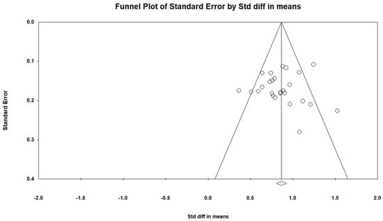 The forest plot (Figure 2) shows the effect size for each study using the SDMT. Overall, information processing speed was significantly lower in the MS sample compared to HC with a large effect size (g = 0.854, 95% CI = 0.765, 0.944, p < 0.001). There was no evidence of outliers; however, moderate heterogeneity (Q = 51.9, p = 0.001) was indicated (I2 = 51.8). There was no evidence of publication bias (Egger’s test: p > 0.05, two-tailed). The funnel plot (Figure 3) indicates that the effect sizes were symmetrical. Duval and Tweedie’s trim and fill analysis estimated that no studies were missing from the analysis.