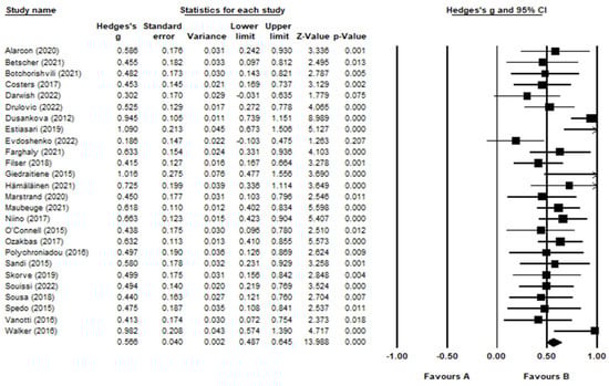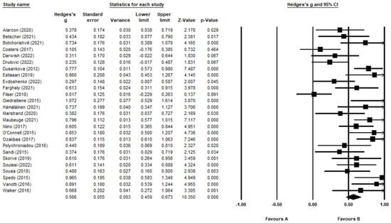 Forest plots were created for each subtest to visually summarise the amount of heterogeneity as well as the estimated effect sizes (Hedges g) and 95% CIs. Funnel plots were also generated as a graphical tool for investigating publication bias and other bias (assessed by the Egger’s test), which, if found, may lead to funnel plot asymmetry []. If asymmetry was shown, the Duval and Tweedie trim and fill analysis would model the data as if it were symmetrically distributed by adjusting for missing studies [].