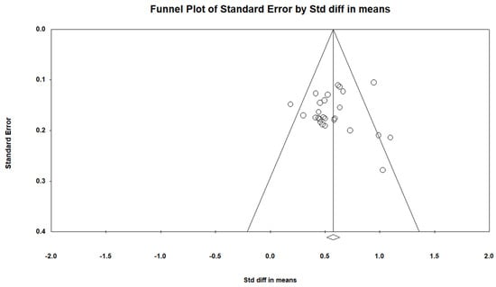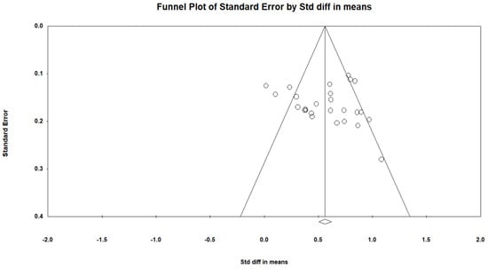 The forest plot (Figure 6) shows the effect size for each study using the BVMT-R. Overall, immediate visual recall memory was significantly lower in the MS sample compared to HC with a medium effect size (g = 0.566, 95% CI = 0.487, 0.645, p < 0.001). There was no evidence of outliers; however, moderate heterogeneity (Q = 42.6, p < 0.05) was indicated (I2 = 41.4). There was no evidence of publication bias (Egger’s test: p > 0.05, two-tailed). The funnel plot (Figure 7) indicates that the effect sizes were symmetrical. Duval and Tweedie’s trim and fill analysis estimated that no studies were missing from the analysis.