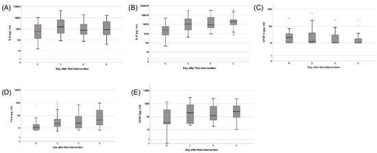 IL-6 showed a fluctuating course with a significant median increase to 1540 pg/mL on day two and 860 pg/mL on day three (p = 0.01 and p = 0.04, respectively) compared to the first measurement Figure 1A.