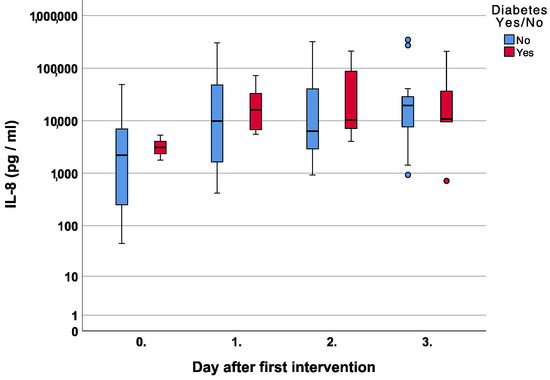 With respect to IL-8, diabetic and non-diabetic patients both showed a gradual increase with higher median values than the diabetics in the first three measurements p = 0.73, p = 0.45, and p = 0.40, respectively Figure 2.