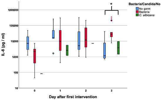 Course of Interleukin 8 (IL-8) over the first four measurements in patients with bacterial, fungal, and no wound contamination. Asterisk (*) indicates significance.