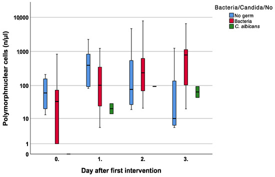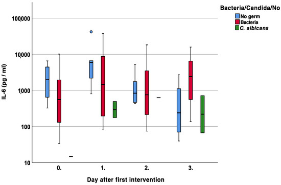 In the group of patients with bacterial and fungal infections, IL-8 showed a steady increase in the presence of bacteria with higher median values of 11,980 pg/mL and 27,000 pg/mL on days two and three compared to 5220 pg/mL and 1180 pg/mL in patients with no superinfection, p = 0.93 and p = 0.05, respectively Figure 3.