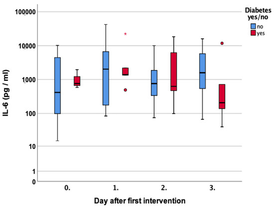 Course of Interleukin 6 (IL-6) over the first four measurements in patients with and without diabetes. Asterisk (*) indicates significance.