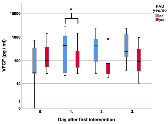 Course of Vascular Endothelial Growth Factor (VEGF) over the first four measurements in patients with and without peripheral artery disease. Asterisk (*) indicates significance.