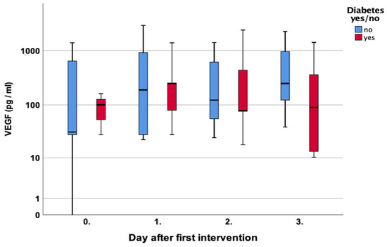 Course of Vascular Endothelial Growth Factor (VEGF) over the first four measurements in patients with and without diabetes.