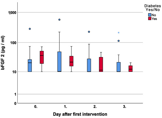 Course of Basic Fibroblast Growth Factor 2 (bFGF 2) over the first four measurements in patients with and without diabetes. Asterisk (*) indicates significance.