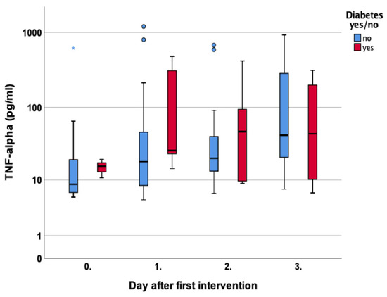 A similar course was noted for Tnf-a levels in diabetic patients who showed higher Tnf-a levels compared to non-diabetics in every measurement until day three, p = 0.54, p = 0.12, p = 0.54, and p = 0.56, respectively Figure 10.