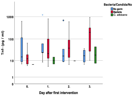 Course of Tumor Necrosis Factor alpha (Tnf-a) over the first four measurements in patients with bacterial, fungal, and no wound contamination. Asterisk (*) indicates significance.